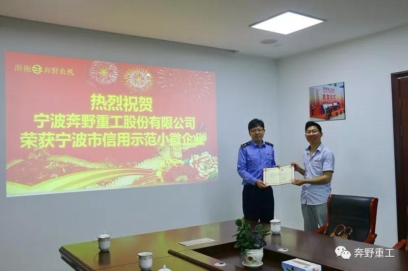 寧波奔野重工股份有限公司繼榮獲“消費(fèi)者信得過(guò)單位”之后,再一次光榮上榜,榮獲“寧波市信用示范小微企業(yè)”榮譽(yù)稱(chēng)號(hào)。尚田鎮(zhèn)市場(chǎng)監(jiān)督所所長(zhǎng)竺海方親自蒞臨我司頒發(fā)榮譽(yù)獎(jiǎng)狀。